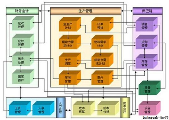 两种软件能够实现的功能也不同,衡量企业经营效益首先要计算产品成本,ERP软件产品在核算产品成本方面有着得天独厚的优势,成本的实际发生过程,要以ERP系统的产品结构为基础,从最底层采购件的材料费开始,逐层向上将每一件物料的材料费、人工费和制造费(间接成本)累积,得出每一层零部件直至最终产品的成本。再进一步结合市场营销,分析各类产品的获利性。ERP把传统的帐务处理同发生帐务的事务结合起来,不仅说明帐务的资金现状,而且追溯资金的来龙去脉--例如将体现债务债权关系的应付帐、应收帐同采购业务和销售业务集成起来、同供应商或客户的业绩或信誉集成起来、同销售和生产计划集成起来等,按照物料位置、数量或价值变化,使与生产相关的财务信息直接由生产活动生成。在定义事务处理相关的会计科目之间,按设定的借贷关系,自动转帐登录,保证了"资金流(财务帐)"同"物流(实物帐)"的同步和一致,改变了资金信息滞后于物料信息的状况,便于实时做出决策。而财务软件由于没有同生产管理集成,所以难以像ERP软件这样方便快捷的核算产品成本,在人力资源管理等方面也是如此。