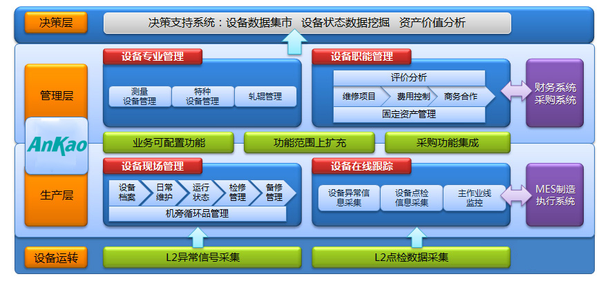 鉴于此,企业逐步引进实施高效的设备管理系统。武汉网神通信息科技软件设备管理系统设计采用自底层向上层归纳,自上层向下层的分解形式,从决策层、管理层、生产层以及设备运转等环节设计,层层紧密联系,环环相扣,在设备应用效率提升的基础上,建立科学的设备管理模型,帮助企业实现规范化、体系化、信息化的设备管理、维护、应用与保养。